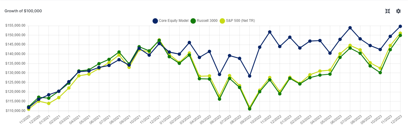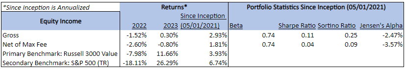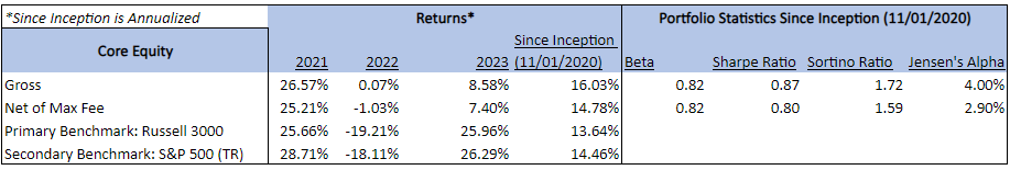 The Core Equity Portfolio has put up strong results since we started it in November of 2020, It has outperformed the benchmark with notably lower market risk (0.82 Beta) and attractive downside protection (1.59 Sortino on the maximum fee). However, 2023 proved challenging for our investment style.