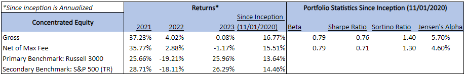 The Concentrated Equity Portfolio has been successful since launch November of 2020, but with greater variation in results in comparison to our Core offering due to having fewer stocks in fewer industries. Since inception, this portfolio has achieved that performance with less market risk (0.79 Beta) while protecting on the downside (1.30 Sortino at Maximum Fee Levels).