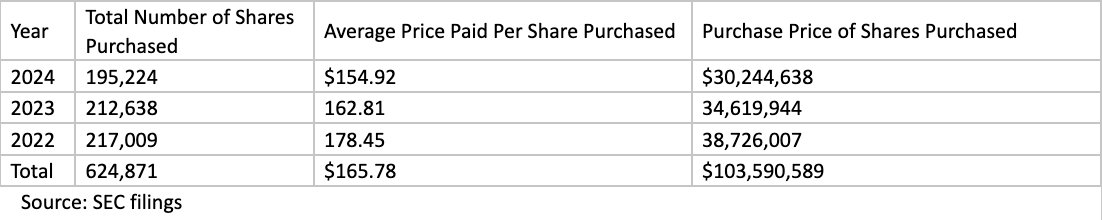 Probably the most attractive and concrete attribute is the company’s approach to capital allocation. Dividends and share buybacks have far exceeded share-based compensation. According to SEC filings, share-based compensation was about $10.7M in 2022, $11.7M in 2023 and $11.8M in 2024 totaling just over $34M for a 3-year period. By contrast, Diamond Hill repurchased more than $103M worth of stock during that same period. In addition, the company pays $1.50/share in quarterly dividends. They also issue special dividends when they have excess cash. From 2022-2024, the company paid almost $65M in dividends. The company will pay another $4/share special dividend on 12/05 of this year for shareholders of record on 11/21. Netting out share-based compensation, the company returned more than $134M to shareholders in the form of dividends and buybacks from 2022-2024. We expect this sort of activity to continue though the magnitude will vary depending on the success of the business. Through the end of Q3, DHIL had repurchased another 22,725 shares and had $35.2M left on their repurchase plan.